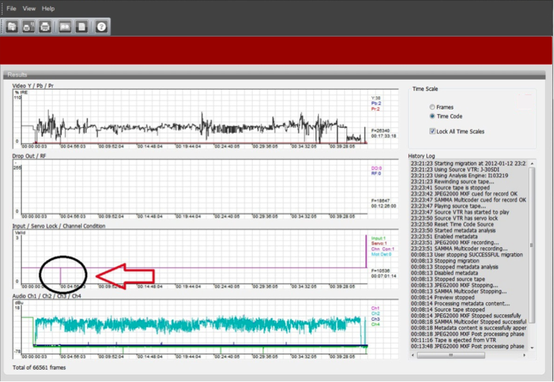 Although most cassettes played back without fault, we discovered some had suffered from physical degradation, which resulted in channel condition errors (which can be sometimes corrected or concealed by the VTR, or result in a digital audio splat, or blocking in the image.) The SAMMA system records any channel condition errors through RS422 VTR control protocol, and is displayed visually as a flagged error in playback. We found that for these problem tapes usually played back better in the DVW’s.